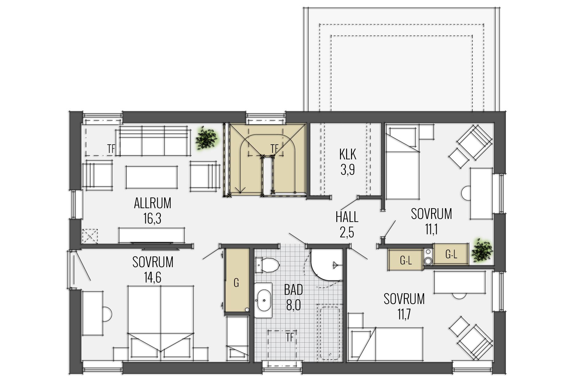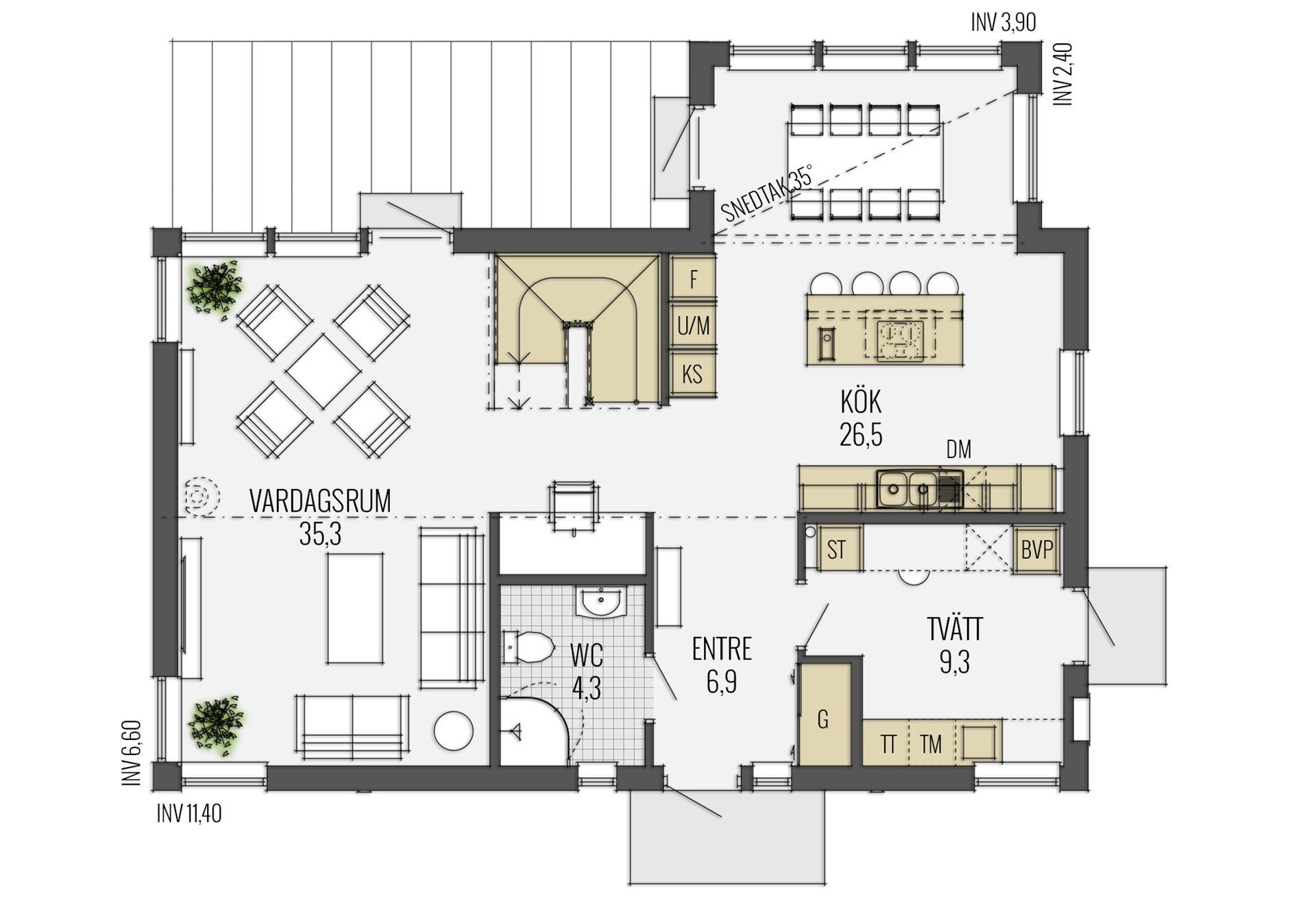 Die geräumige Küche besteht aus viel Arbeitsfläche und einem Essbereich, getrennt durch eine Kücheninsel. Das Wohnzimmer bekommt seine Abgeschiedenheit durch den Treppenaufgang in das Obergeschoss. Die Fenster, zum Teil bodentief, sorgen für morgen- und abendliche Sonne in allen Bereichen.