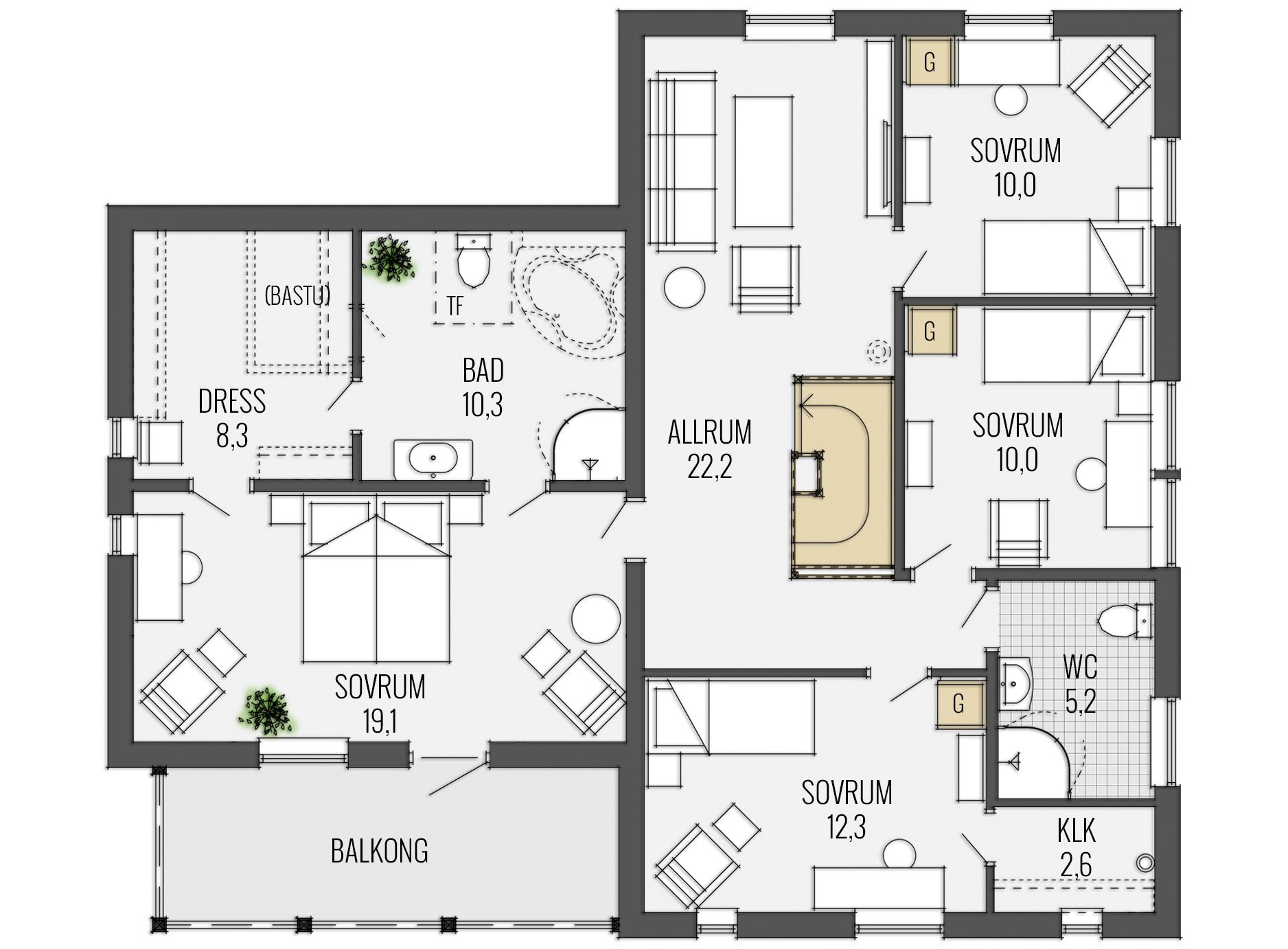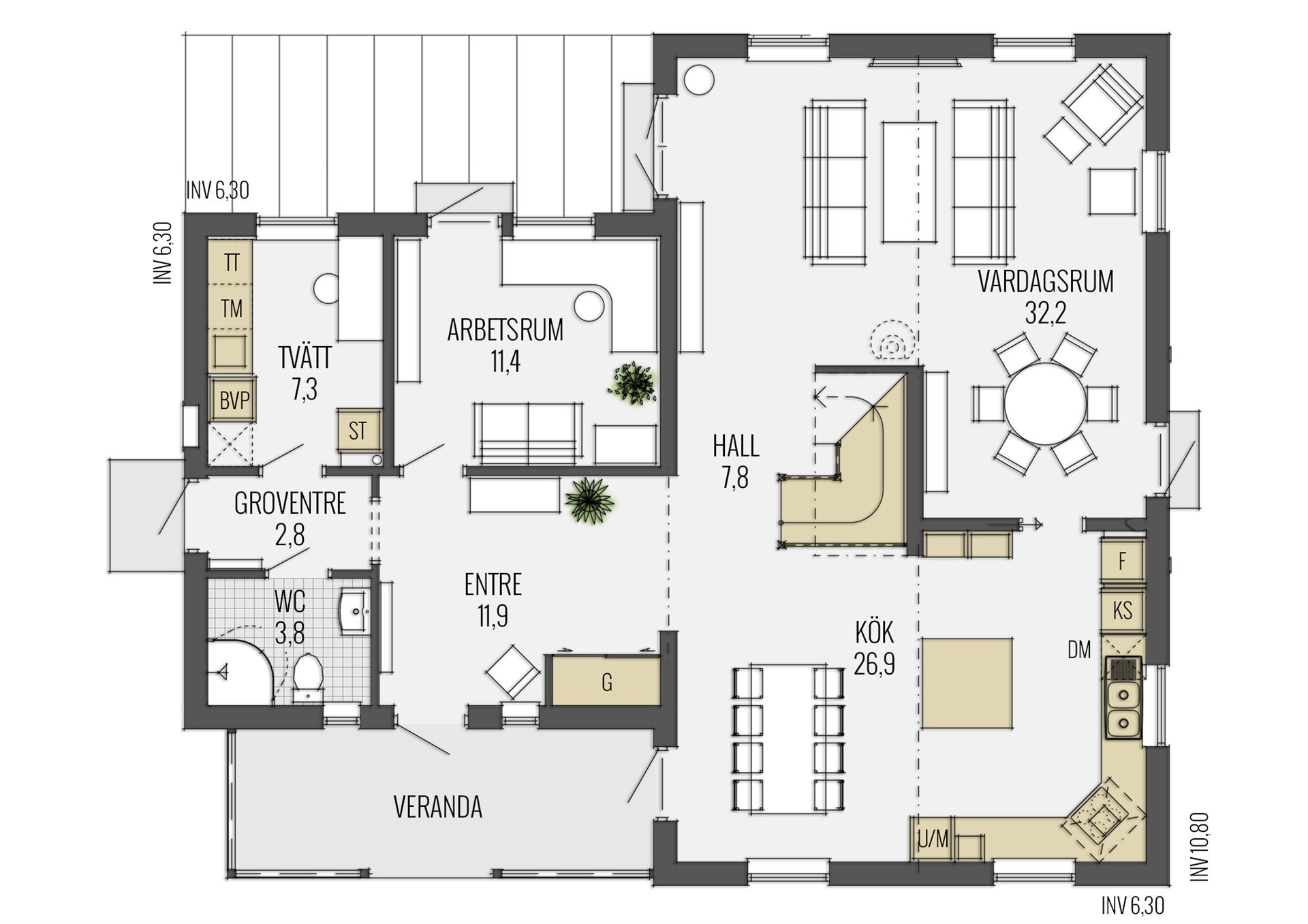 Dieses schwedische Landhaus mit seiner Drei-Giebelkonstruktion und der vorgesetzten Veranda mit Balkon verleihen dem Haus eine besondere Note und unterstreichen durch perfekte Proportionen die harmonische Architektur schwedischer Landhäuser. Der gut durchdachte Grundriss ermöglicht einer vierköpfigen Familie großzügigen Lebensraum.