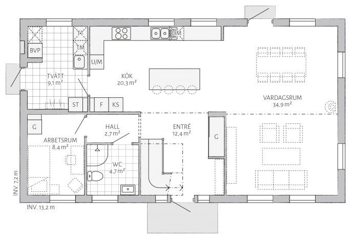 Dieses schöne, stilvolle Landschaftshaus ist von den Traditionen der südlichen schwedischen Provinzen geprägt. Weiß verputzt, mit markantem Dachfries unter dem Dachüberstand, und mit ausgewogen proportionierten Fenstern bekommt das Haus einen klaren, harmonischen Charakter. Die im Kontrast zum Putz graue Dekorfarbe, der Details, verstärkt den Ausdruck der Linienführung.