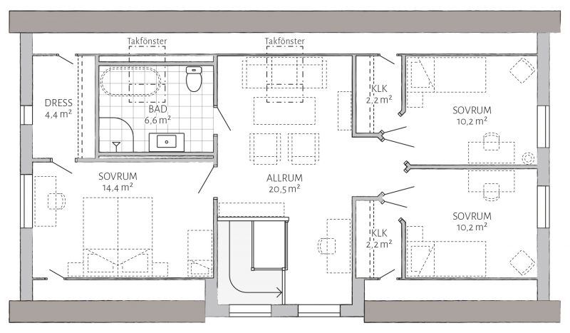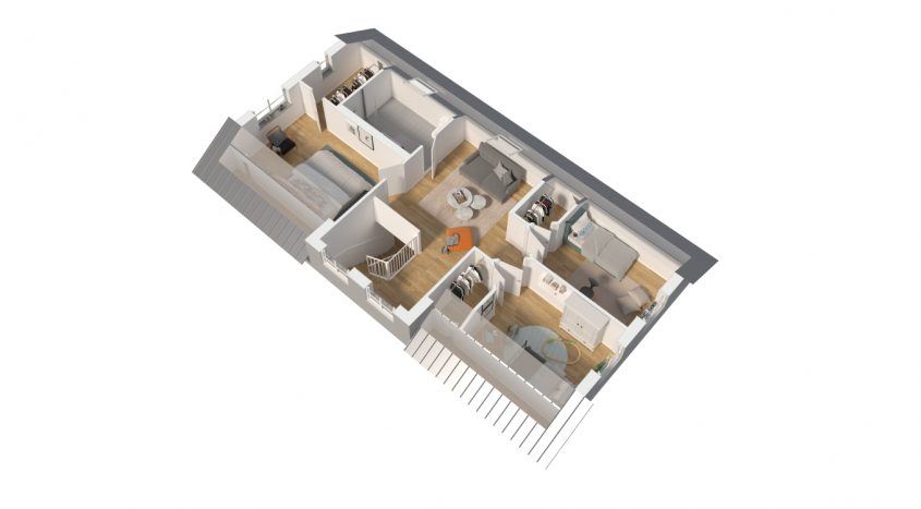 Der Gemeinschaftsraum trennt die Kinderschlafzimmer vom Elternschlafzimmer und sorgt so für Abgeschiedenheit. Das Vollbad bietet genug Raum für eine gemeinsame Nutzung. Durch zusätzliche Dachflächenfenster kann noch mehr Licht in die Räume gebracht werden.