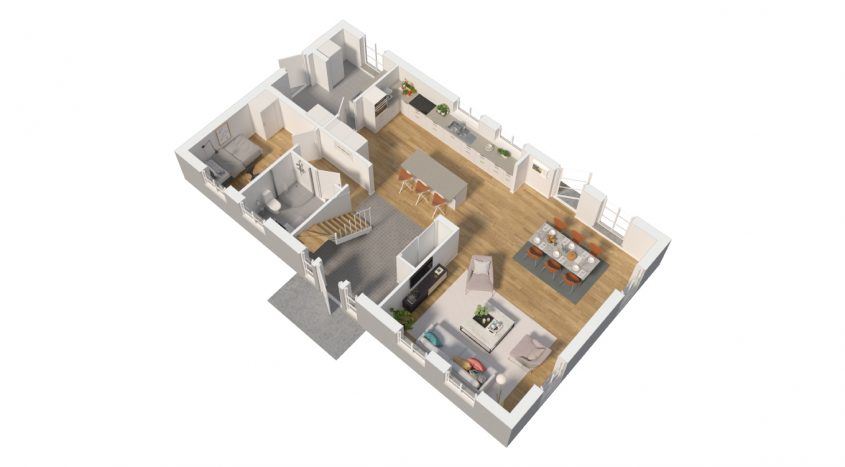 Die geräumige Eingangshalle verbindet nicht nur die Räume des Erdgeschosses, sondern ermöglicht über eine 1/4 gewendelte Treppe den Zugang zum Obergeschoss. Die Küche, modern eingerichtet mit einer Kochinsel, liegt zwischen Wohn- und Hauswirtschaftsraum. Im Wohnzimmer sorgen Fensterpartien in drei Himmelrichtungen für eine ausgewogene Belichtung des Raumes.