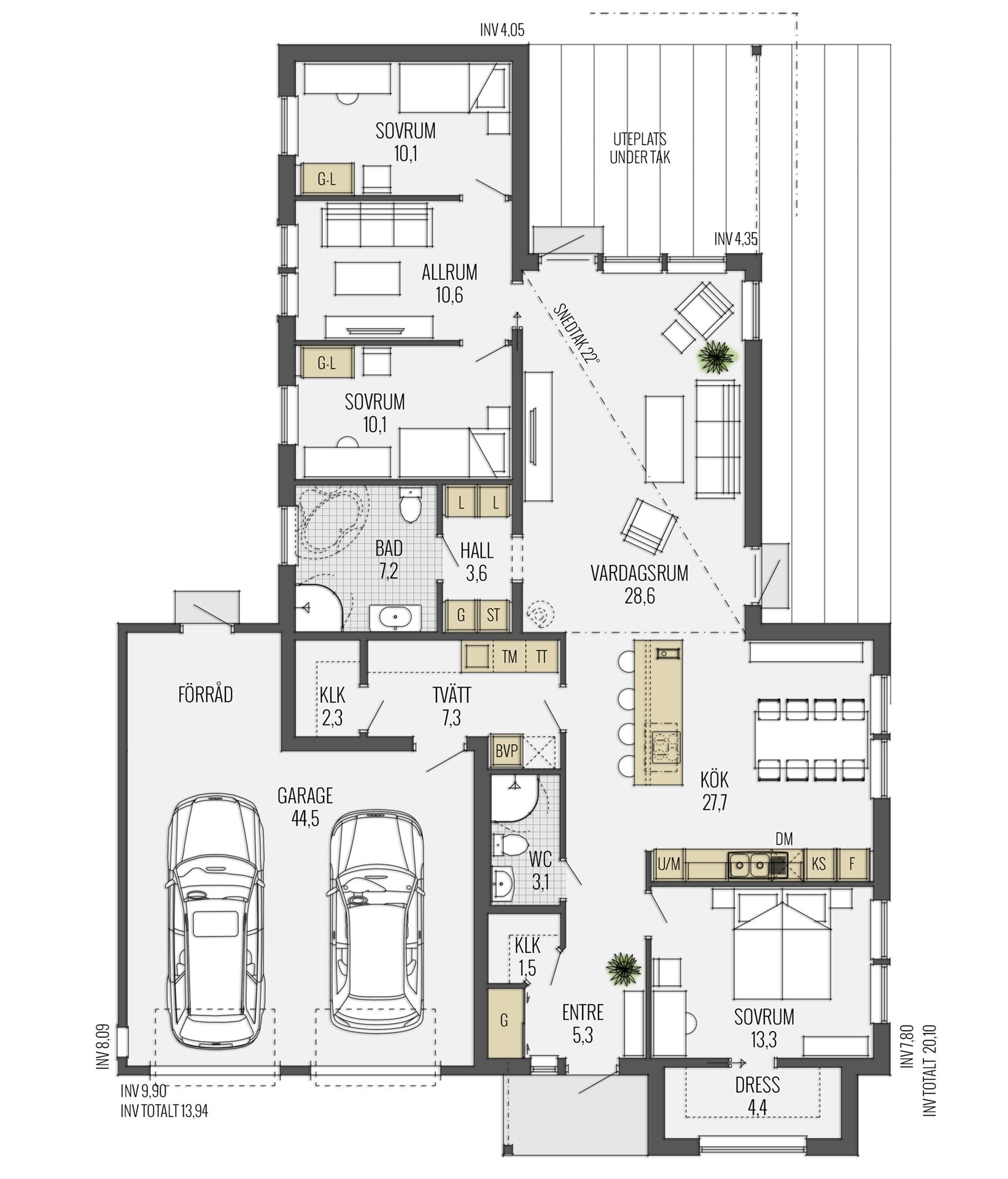 Der gut durchdachte offene Grundriss kommt, typisch schwedisch, ganz ohne Flure aus. Vom Eingangsbereich aus eröffnet sich dem Besucher ein atemberaubender Blick durch die Längsachse des gesamten Hauses. Bodentiefe Glaselemente des Wohnbereiches lenken den Blick hinaus in die freie Natur. Hier wurde nichts dem Zufall überlassen. Die Kinderzimmer werden über einen gemeinsam genutzten sogenannten Allrum erreicht. Von der offenen Küche kommt man direkt über den Hauswirtschaftsraum in die Garage. Der zentrale Punkt des Bungalows ist das Wohnzimmer mit seiner imposanten Deckenhöhe.