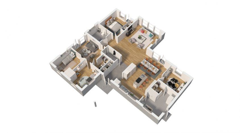 Die Schlafräume befinden sich abgeschirmt auf der linken Seite des Hauses. Von hier aus erreicht man auch das Badezimmer und den Gemeinschaftsraum. Der ansonsten offen gehaltene Grundriss unterstützt eindrucksvoll den Lichteinfall über die bodentiefen Fensterelemente des Wohnbereiches. Ein weiterer zur Verfügung stehender Raum kann als Gästezimmer oder Arbeitszimmer dienen.