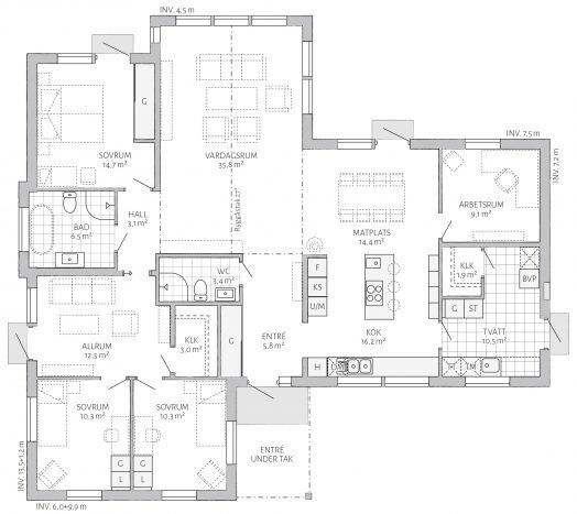 Die 159 m² auf einer Ebene wurden mit vielen innovativen und nützlichen Lösungen geplant. Das Walmdach, die Holzfassade und das Dreiecksfenster auf der Rückseite verleihen der Außenansicht eine elegante Note. Mit drei Schlafräumen ist dieser Bungalow bestens für die Familie geeignet.