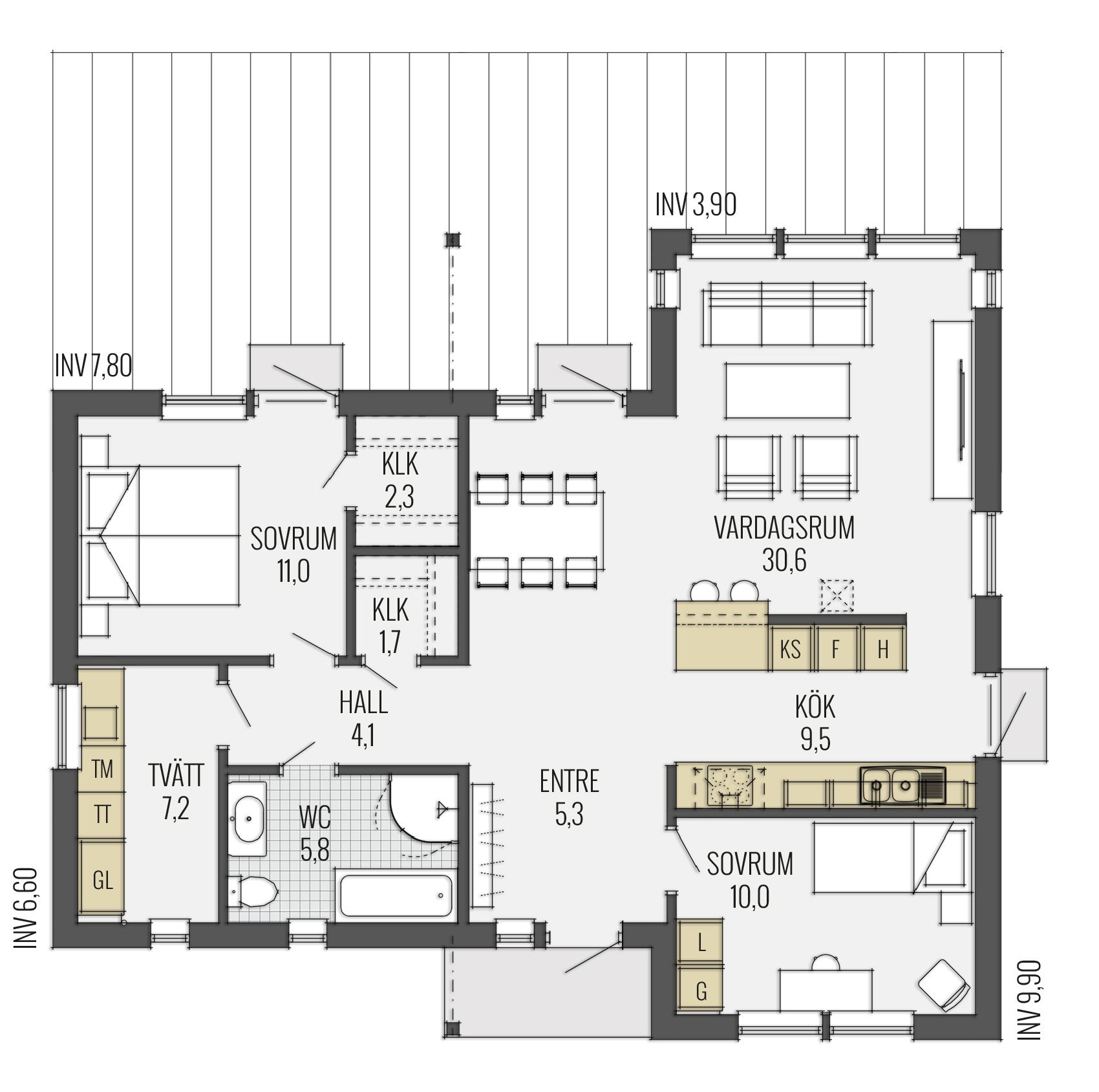 Mit dem Begriff Bungalow verbindet man oft Ferienhäuser oder Sommerhäuser. Diese Planung zeigt ein „Ganzjahreshaus“ mit typisch schwedischem Grundriss, bodentiefen Fenstern, lichtdurchfluteten Räumen und klaren Strukturen.