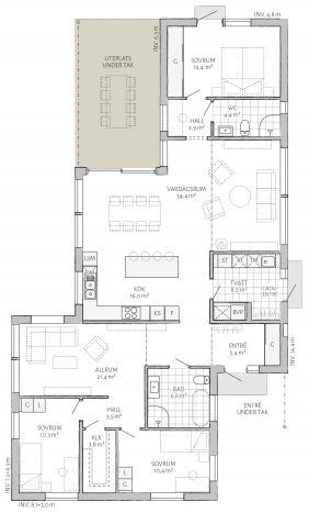 Dieser moderne, minimalistische eingeschossige Entwurf erinnert an den berühmten Bauhausstil von Walter Gropius. Dass auch heute noch, nach über 100 Jahren Bauhaus, dieser Stil aktuell ist zeigt Ramsjö sehr eindrucksvoll. Als Inbegriff der Moderne begeistert diese Architektur immer mehr Bauherren. Klare Linien, minimalistisches Design und die klare Formensprache geben diesem Haus seine Prägung. Die Fassadengestaltung aus Putz und Holz, unterstreicht diesen Eindruck und bedient diese zeitlose Architektur hervorragend.