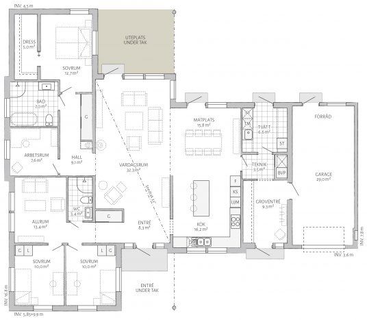 Ein neues, großes, eingeschossiges Haus im Baustil der Funkis – den revolutionären Bauwerken der ’60er Jahre des letzten Jahrhunderts. Solängen ist ein Meisterwerk moderner schwedischer Architektur mit einer ausdrucksstarken klaren Linienführung. Der harmonische Gesamteindruck bestimmt nicht nur das Äußere des Gebäudes, sondern setzt sich auch in dem eleganten Inneren des Hauses fort. Das Entree von Solängen ist designbestimmend und durch eine Überdachung geschützt.