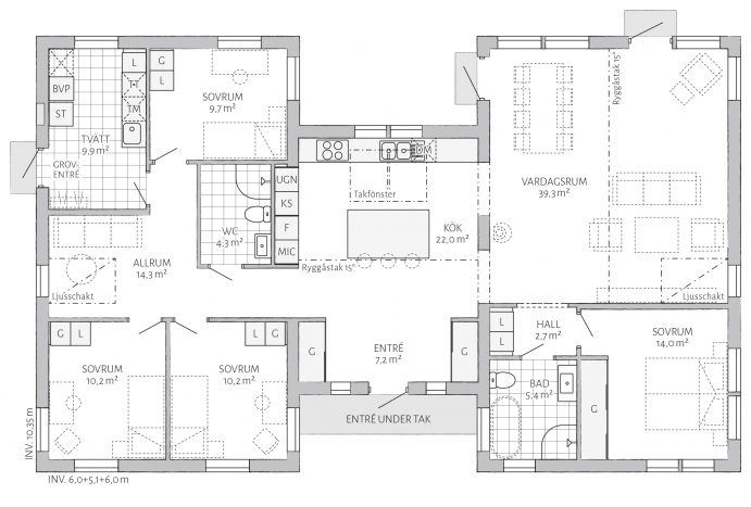 Der Vorteil dieser Planung liegt in der zentralen Funktion des mittleren Baukörpers. Von hier aus kann nicht nur jeder Raum des Hauses erreicht werden, sondern auch ein großer Koch- und Essbereich lädt die Bewohner zum Einnehmen der Mahlzeiten ein. In der offenen Küche ist Raum genug um gemeinsam Rezepte auszuprobieren und zu Kochen. Vom Elternschlafzimmer, das gleich neben dem Wohnzimmer liegt, gelangt man in das große Badezimmer mit Dusche und Wanne. Ein zweites Bad teilen sich Kinder und Besucher. Ganz praktisch, lässt sich der Hauswirtschafstraum über eine Nebeneingangstür auch von außen betreten. Ein begehbarer Kleiderschrank und ausreichend Stauraum runden das Platzangebot ab.