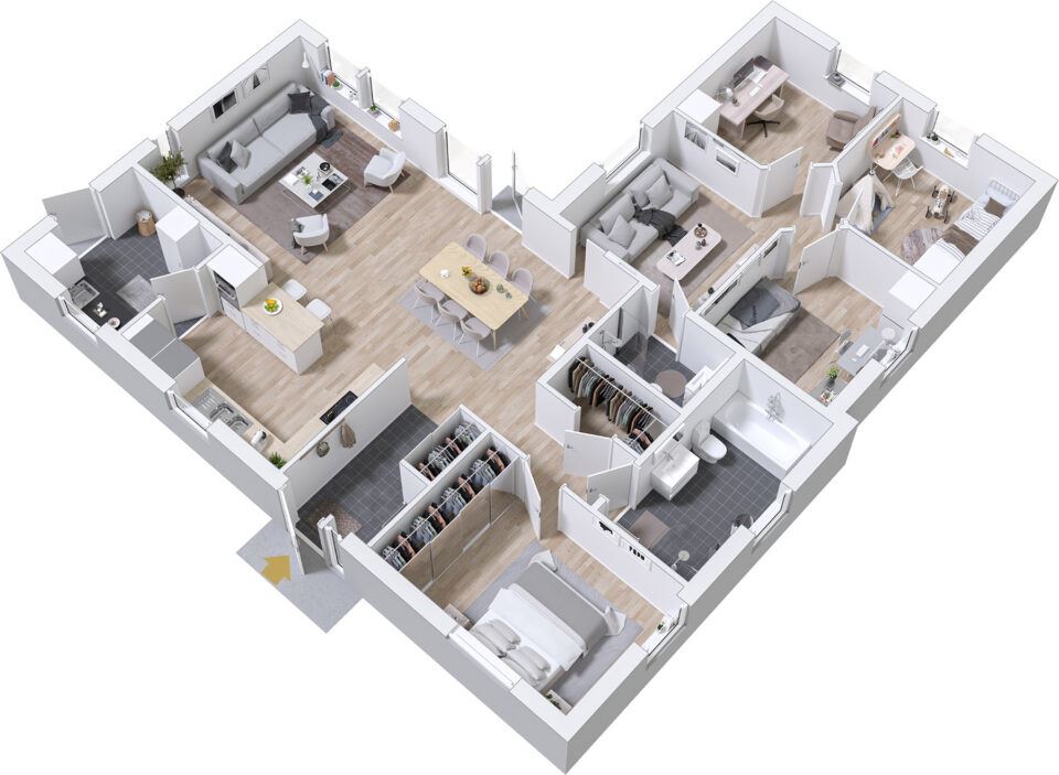 Präzise Details und schmale Dachvorsprünge verleihen dem Prio 141 Industrial einen großartigen Charakter. Mit einer Formensprache, die an Künstlerateliers und Scheunen erinnert, passt es sowohl aufs Land als auch in die Stadt. Prio 141 ist ein Eckhaus, bei dem alle Flächen genutzt werden können. Erleben Sie das wunderbare Gefühl, das in den Bereichen zwischen Küche und Wohnzimmer entsteht und wie die Ecke des Hauses für eine geschützte und angenehme Terrasse auf der Rückseite sorgt. Mit einer Waschküche, mehreren Schlafzimmern und viel Stauraum gibt es Platz für alles, was die Familie braucht.