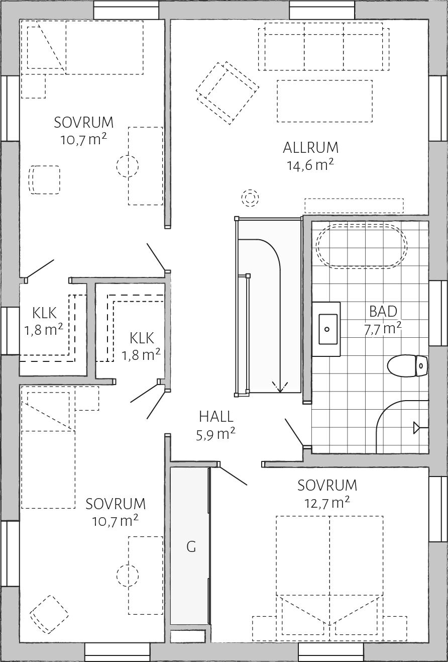 Ein stilvolles Äußeres verleiht dem Prio 145 Modern einen eleganten und einladenden Ausdruck, der in allen Umgebungen funktioniert. Prio 145 ist ein zweistöckiges Haus, das sich mit der Familie verändern kann. Wenn die Kinder ausziehen, können Sie die Schlafzimmer im Obergeschoss ganz einfach in begehbare Kleiderschränke oder Arbeitszimmer verwandeln. Die Treppe, die sich in der Mitte des Hauses befindet, verbirgt viel Platz zum Verstauen der Oberbekleidung der Kinder. Oder das Golfsets.
