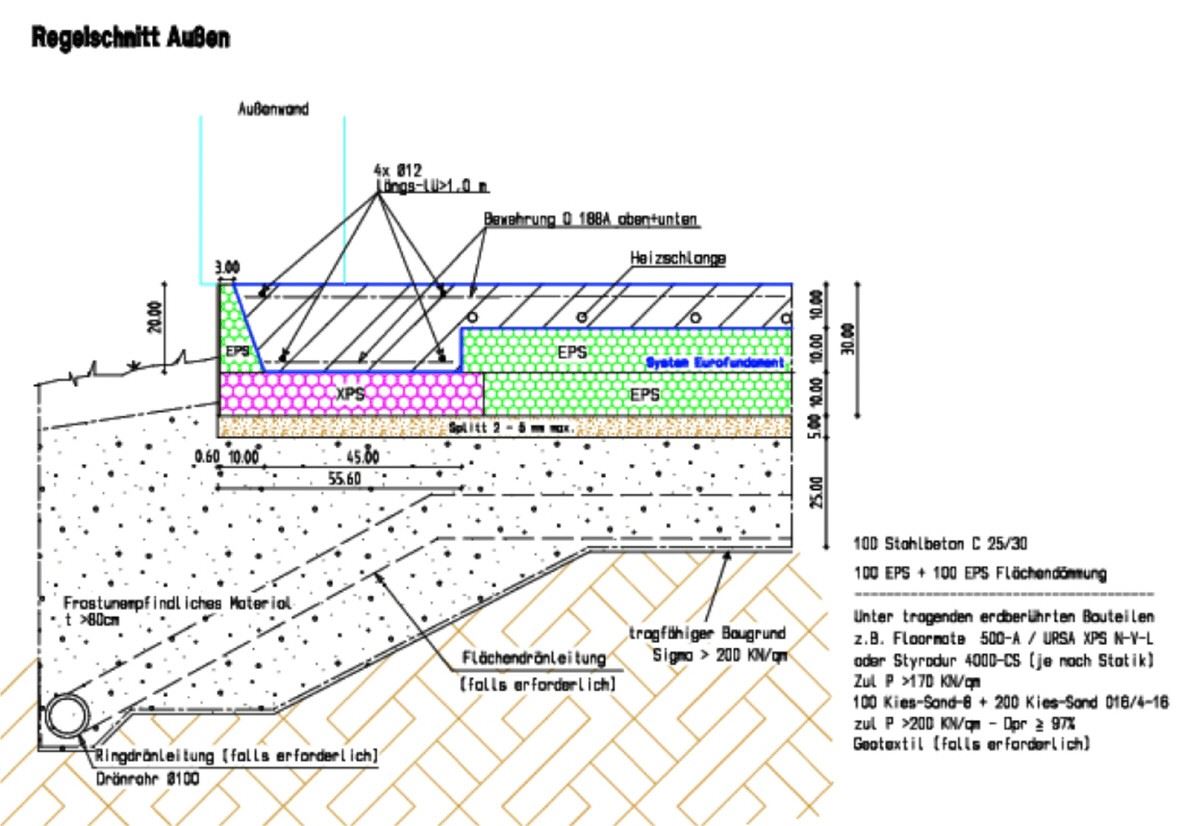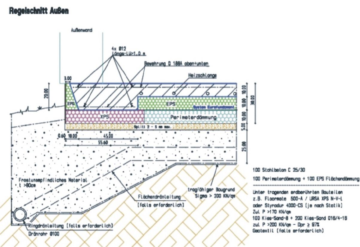 Die erste Lage besteht aus XPSN-V-L Platten, auf denen später die tragenden Außen- und Innenwände stehen werden. In der Fläche wird Perimeter-Material mit Zulassung eingesetzt. Zwischen erster und zweiter Lage der insgesamt 200 mm dicken Dämmung wird eine Sperrbahn im Sinne der DIN 18195 als Feuchtesperre eingelegt.