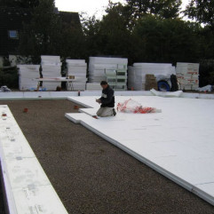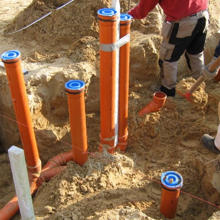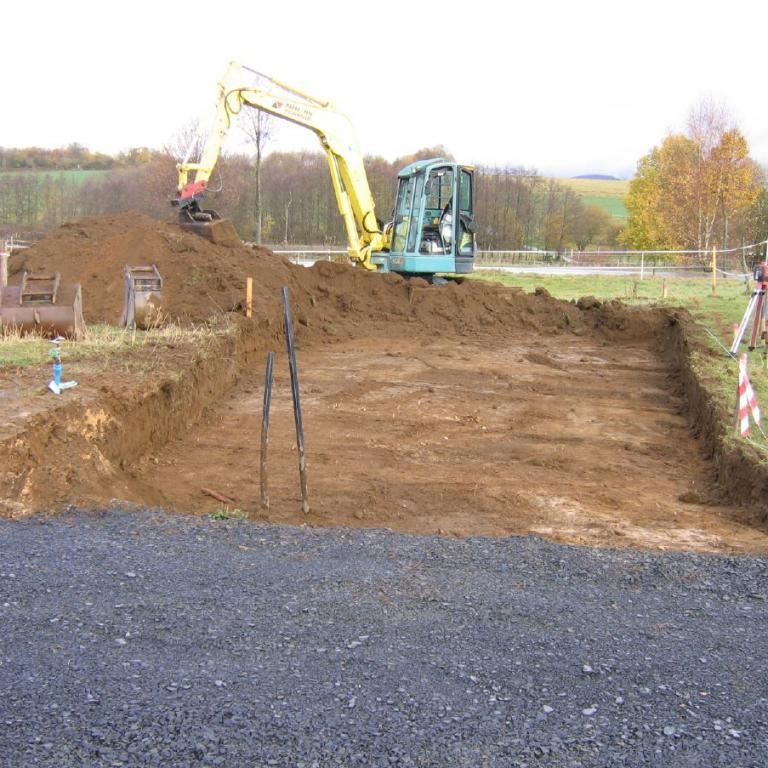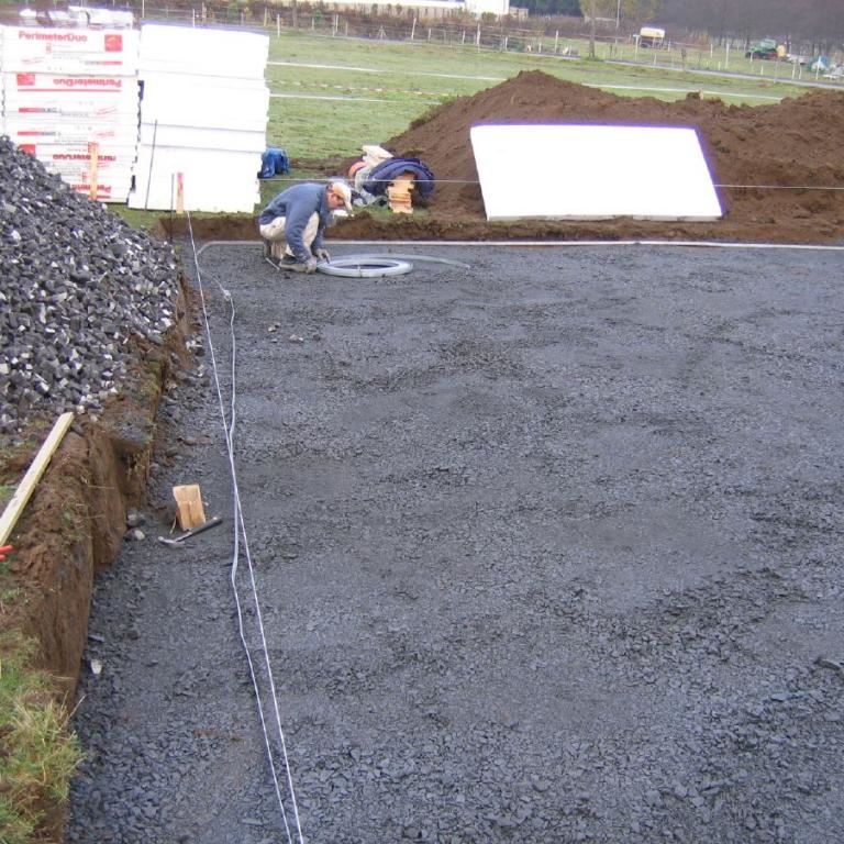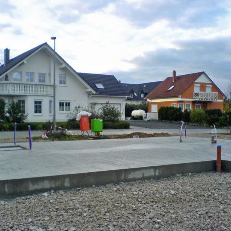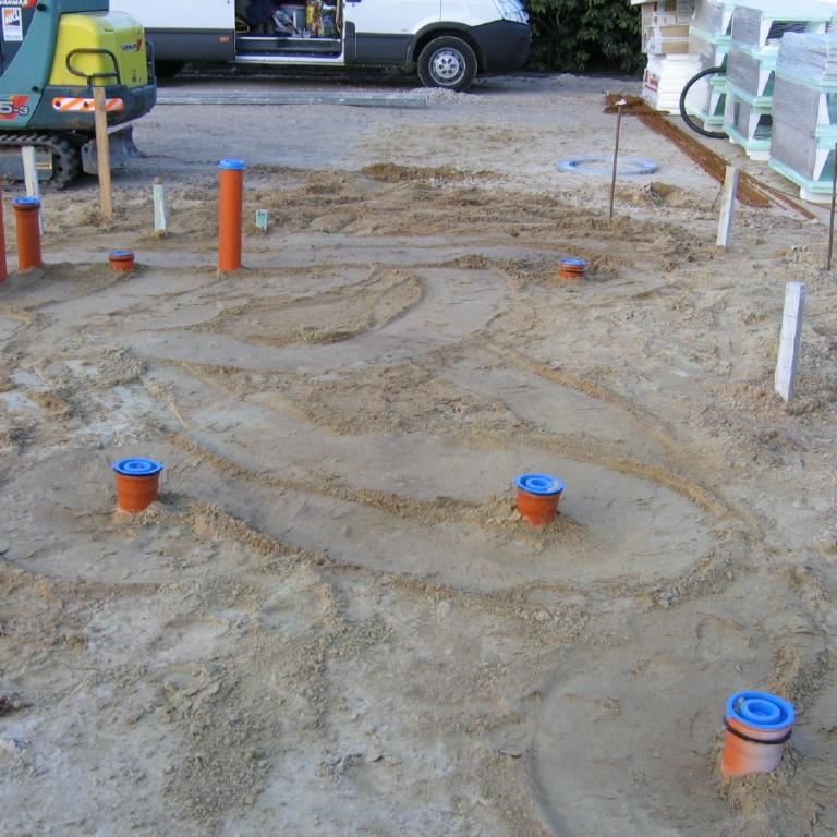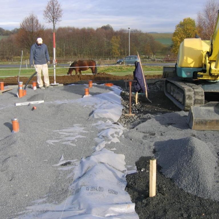 Vor dem Verlegen der Kantenelemente werden die Abwasserleitungen, Leerrohre für die Medien und der Fundamenterder im Unterbau kann auch Recyclingmaterial Verwendung finden. Zum genauen Abziehen der Oberfläche wird Splitt oder Kies verwendet.