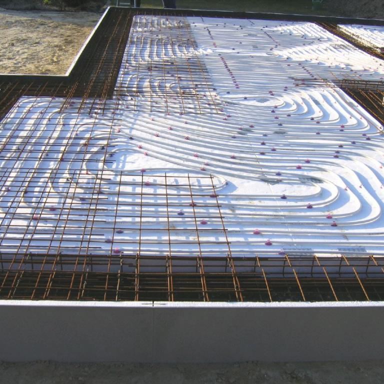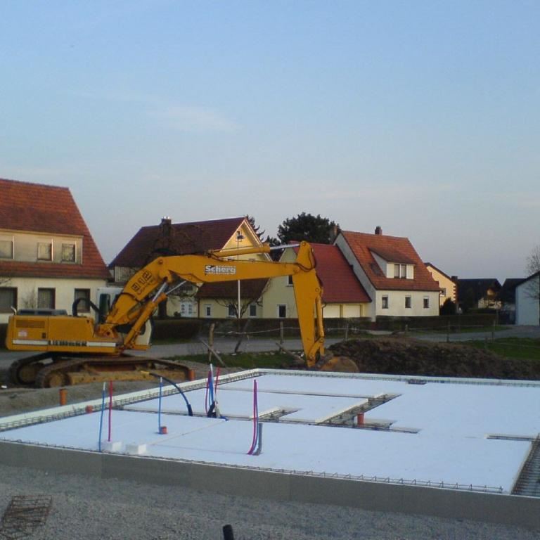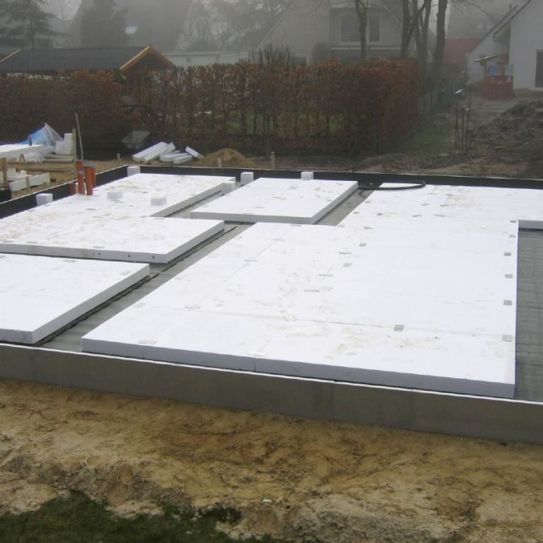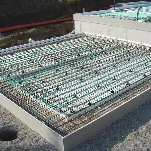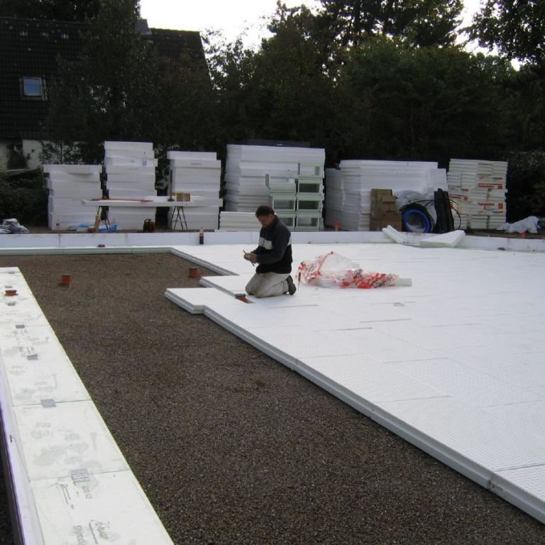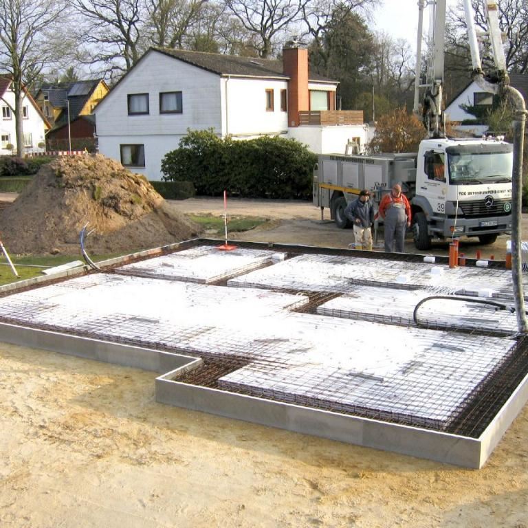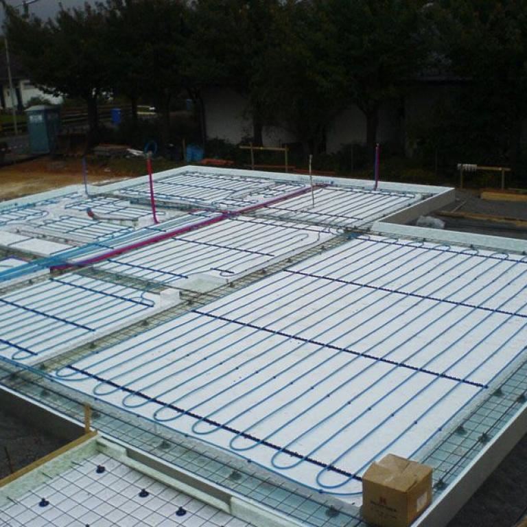 Die Verlegung der Fußbodenheizung erfolgt entsprechend der künftigen Raumaufteilung. Der Bewegungsstahl wird dann gemäß Statik verlegt und der Beton kann geliefert werden. Das Fundament wird betoniert und oberflächenfertig hergestellt. Der Hausmontage steht nun nichts mehr im Weg. Estrich, Abwasser, Dämmung und Fußbodenheizung sind vor Hauslieferung fertig.