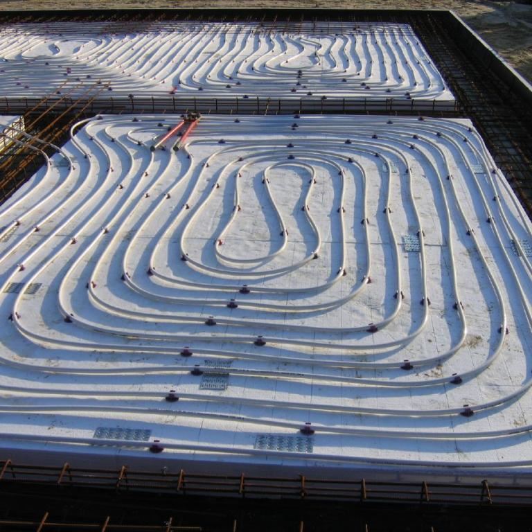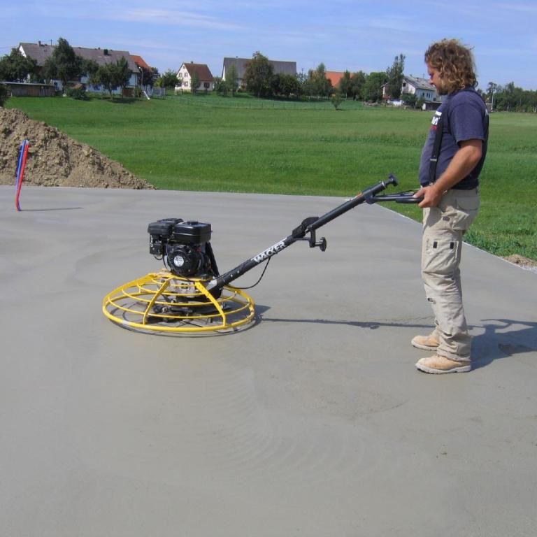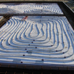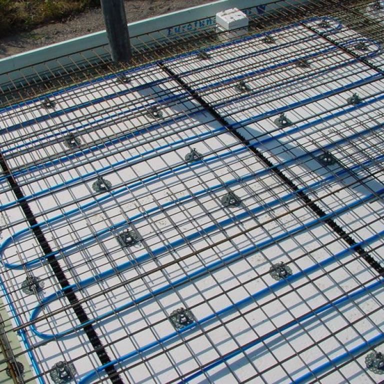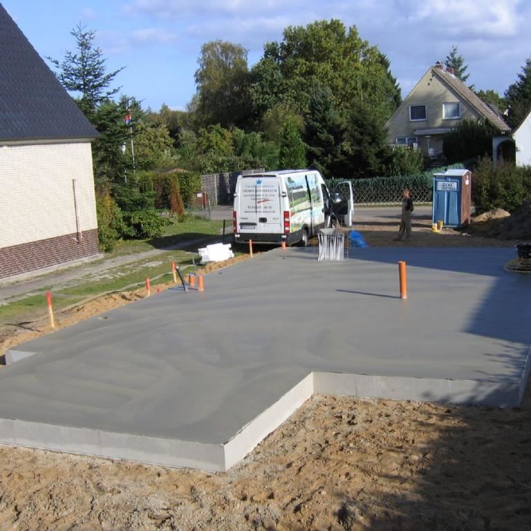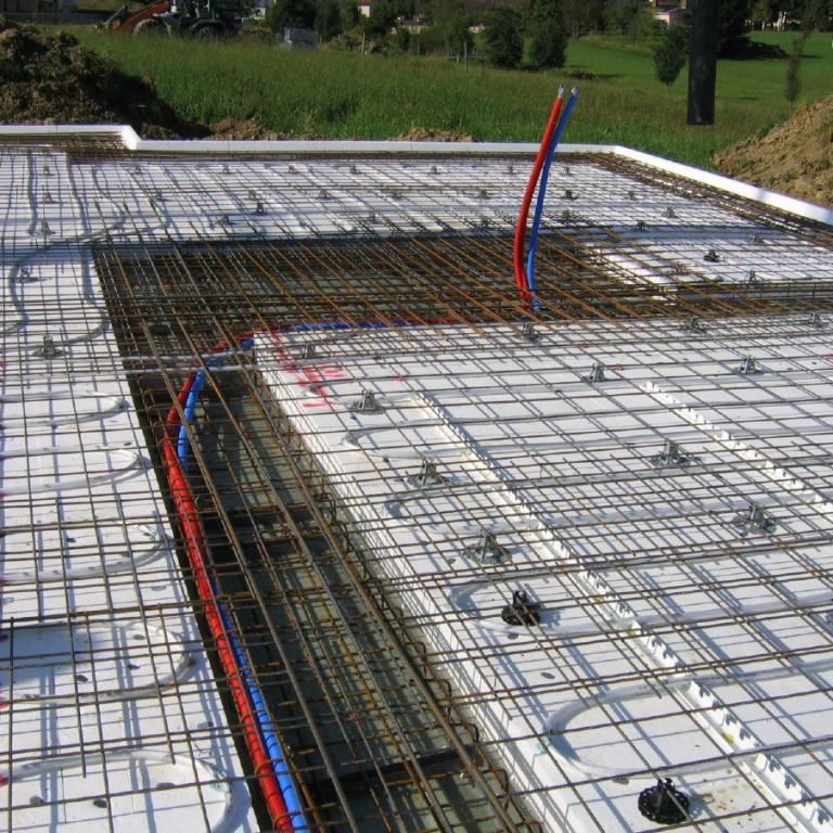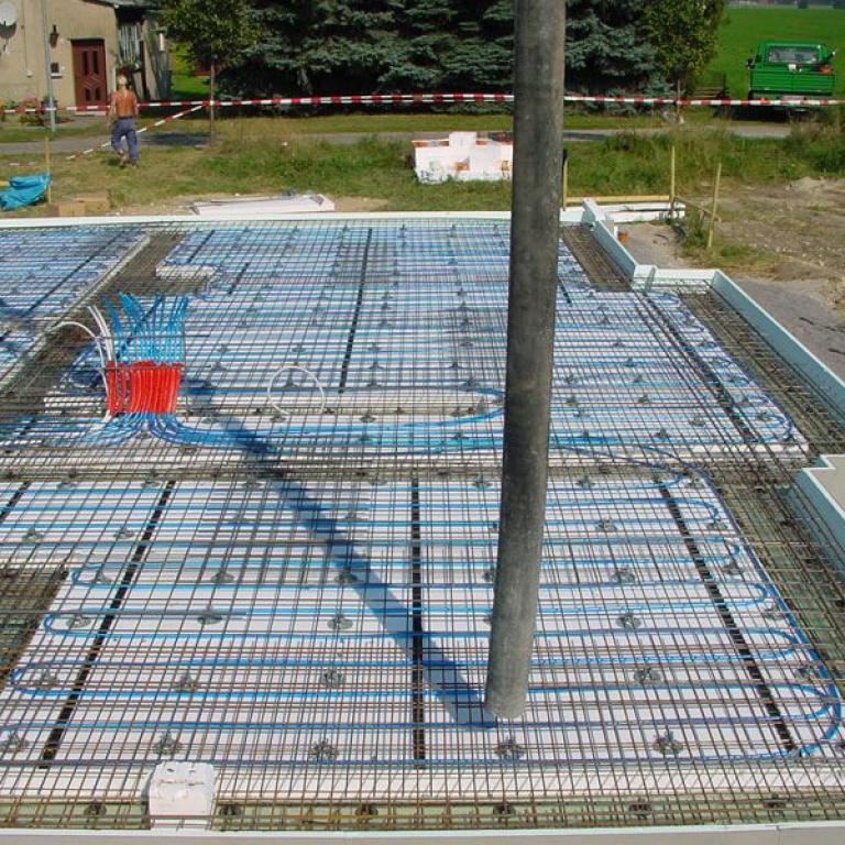 Die Verlegung der Fußbodenheizung erfolgt entsprechend der künftigen Raumaufteilung. Der Bewegungsstahl wird dann gemäß Statik verlegt und der Beton kann geliefert werden. Das Fundament wird betoniert und oberflächenfertig hergestellt. Der Hausmontage steht nun nichts mehr im Weg. Estrich, Abwasser, Dämmung und Fußbodenheizung sind vor Hauslieferung fertig.